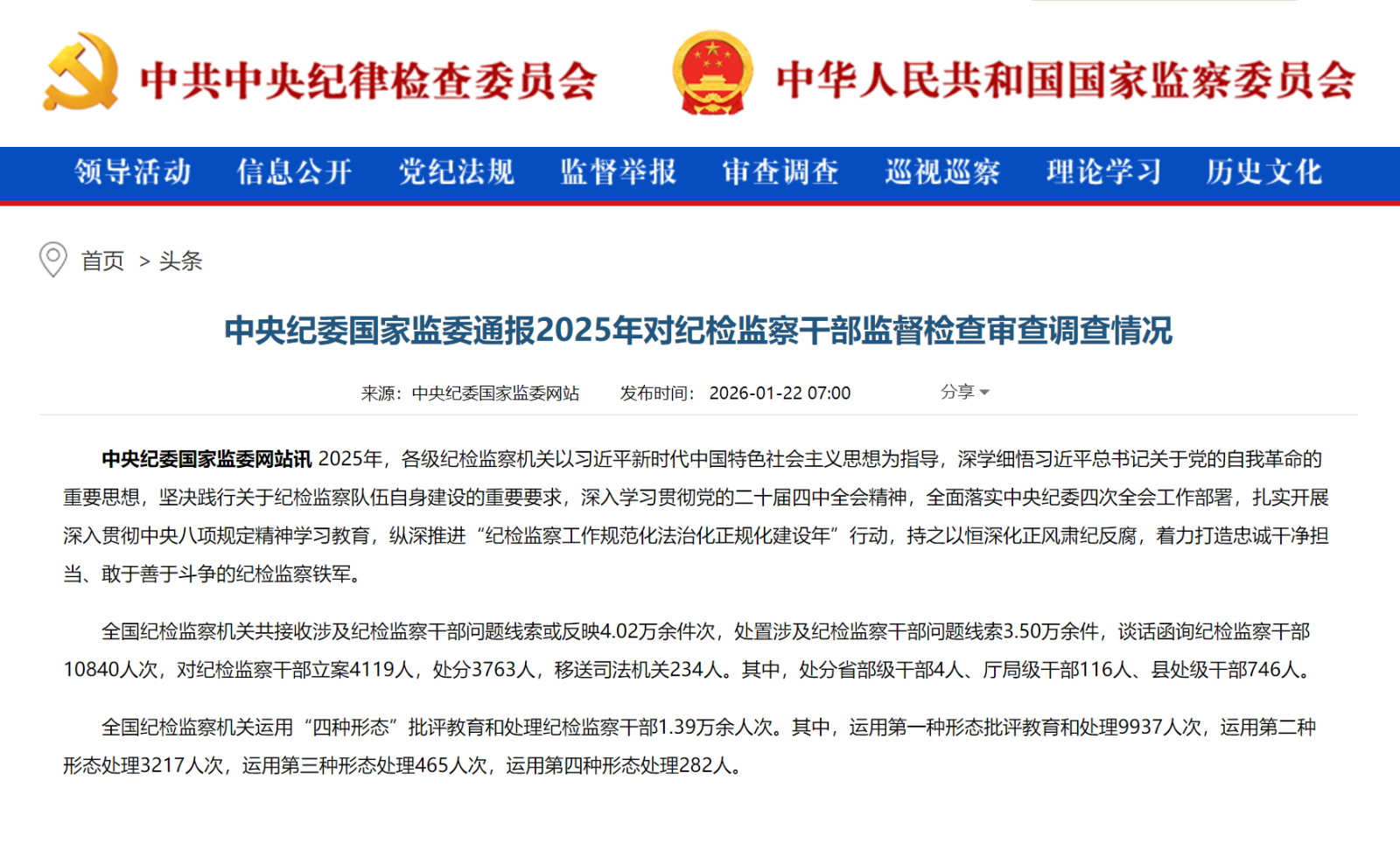 全国纪检监察机关共接收涉及纪检监察干部问题线索或反映4.02万余件次,处置涉及纪检监察干部问题线索3.50万余件,谈话函询纪检监察干部10840人次,对纪检监察干部立案4119人,处分3763人,移送司法机关234人。其中,处分省部级干部4人、厅局级干部116人、县处级干部746人。